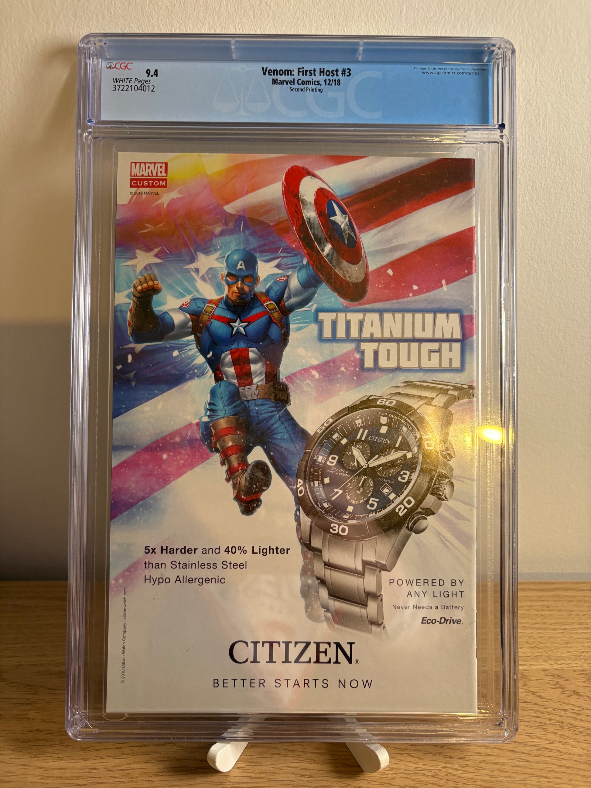 Marvel Comics – Venom: First Host #3 (2018), 2nd Print Bagley cover, graded CGC 9.4 (Near Mint). Professionally graded and sealed by Certified Guaranty Company (CGC). This issue features strong visual appeal with sharp presentation inside a clean CGC slab — a great collectible for Venom and modern Marvel fans.