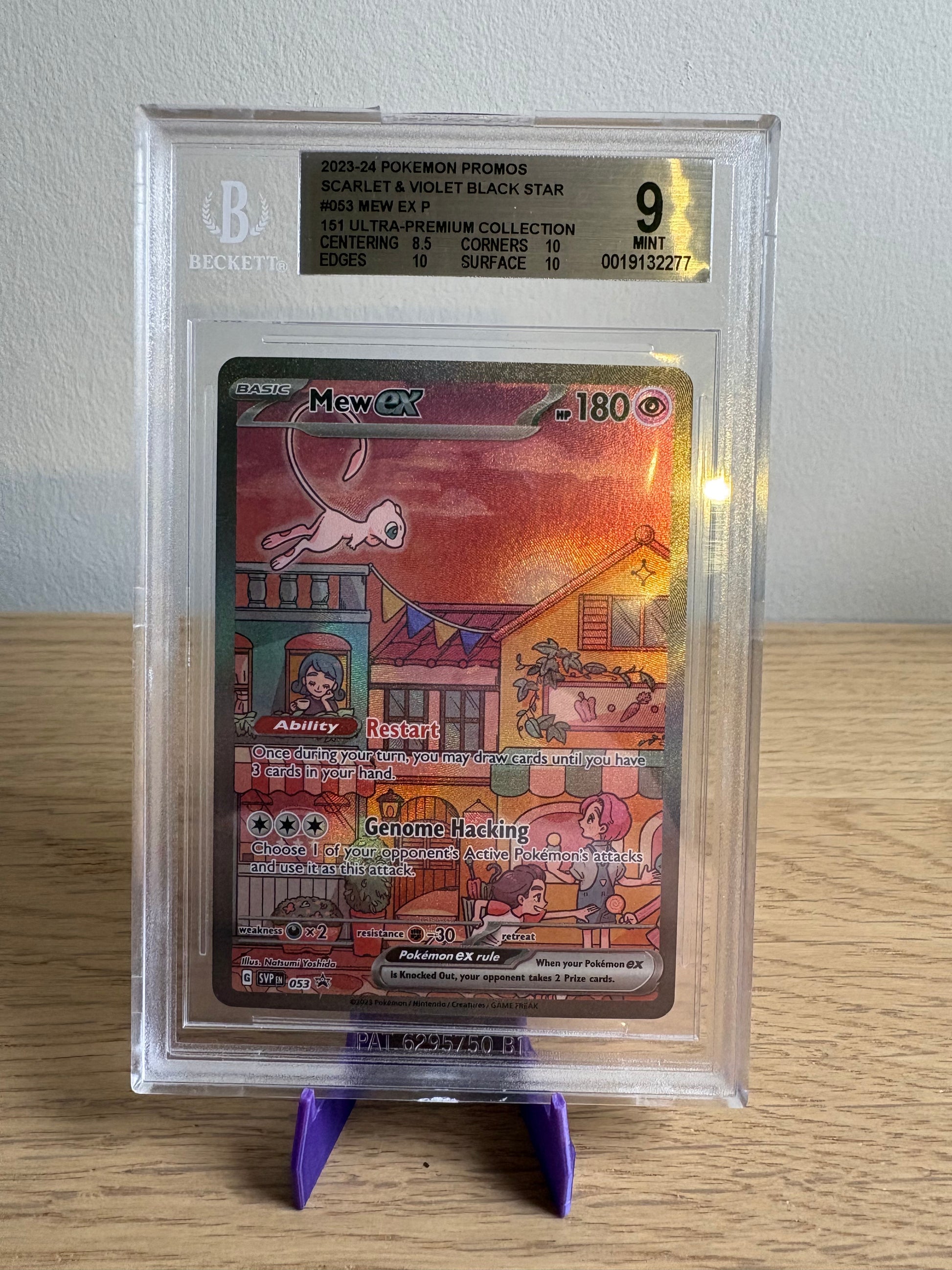 Pokémon Trading Card Game – Mew ex #53 Promo card, graded BGS 9 (Mint). Professionally graded and sealed by Beckett Grading Services. This iconic Mew ex promo features vibrant artwork and strong overall eye appeal — a fantastic collectible for Pokémon fans and graded-card collectors.