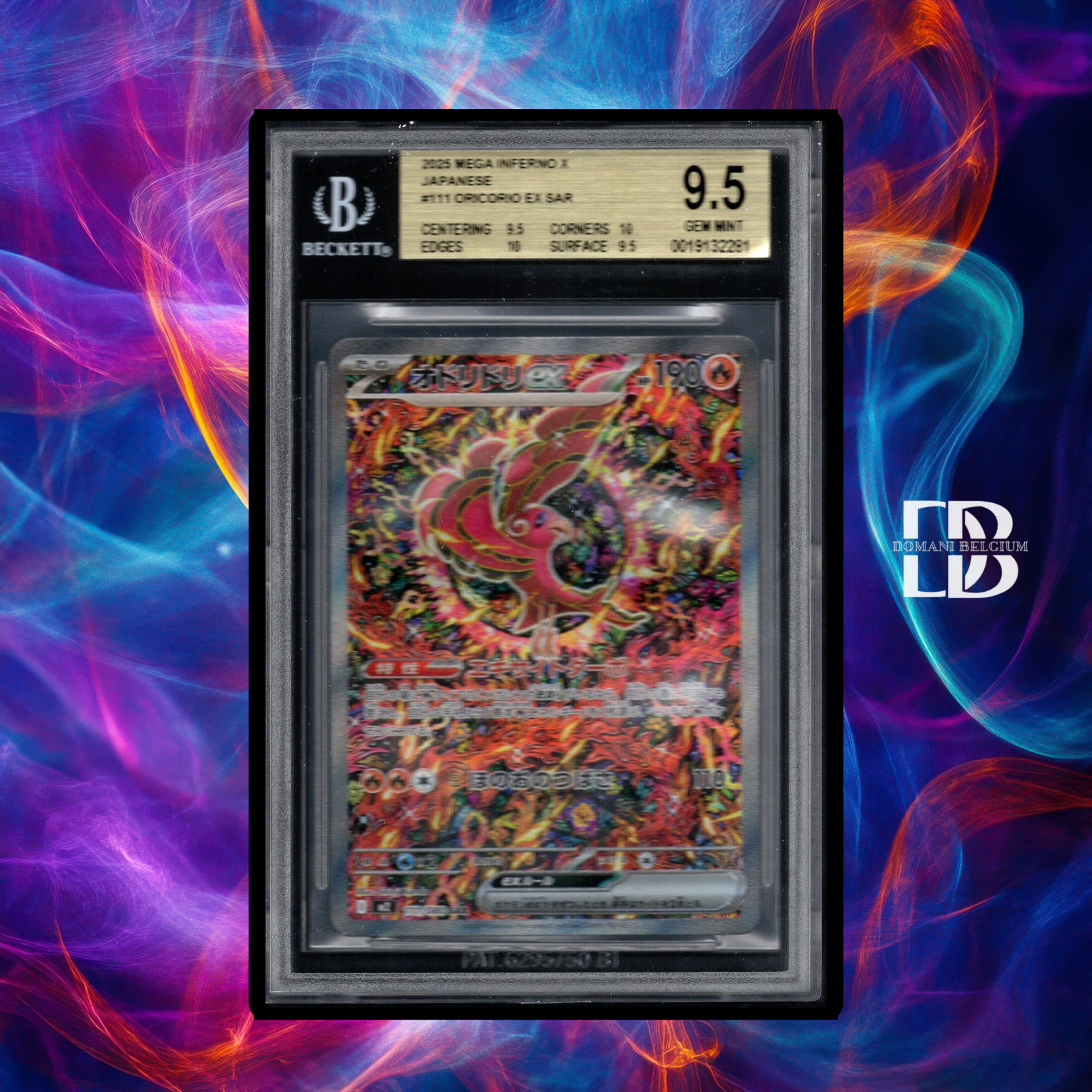 Pokémon Trading Card Game – Oricorio ex #111 from the Japanese Inferno X set, graded BGS 9.5 (Gem Mint). Professionally graded and sealed by Beckett Grading Services. This colorful ex card features clean surfaces, sharp edges, and excellent centering — a strong modern Japanese collectible in a premium slab.